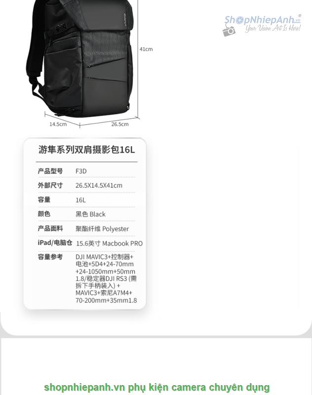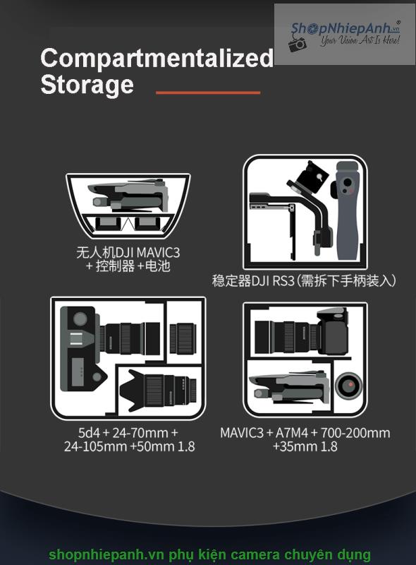 -để vừa nhiều vật dụng như Mavic 3+5D4+24-70+24-105+50F1.8 hoặc DJI RS3+A7IV+70-200+35F1.8 và các phụ kiện tripod. pin, sạc, đồ vệ sinh lens, micro thu âm...