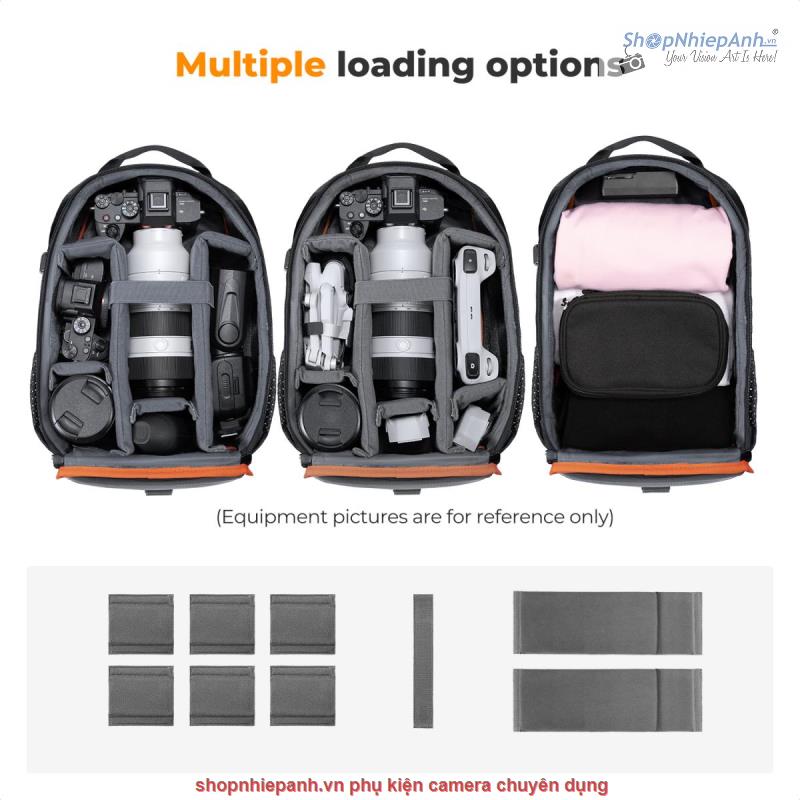 * 【Nâng cấp dung tích】 (Dung tích túi khoảng 10L); Chứa được 2 máy ảnh + nhiều ống kính + máy tính cỡ 12in (Ipad Pro/Ipad Air/Surface) + chân máy ảnh + phụ kiện;