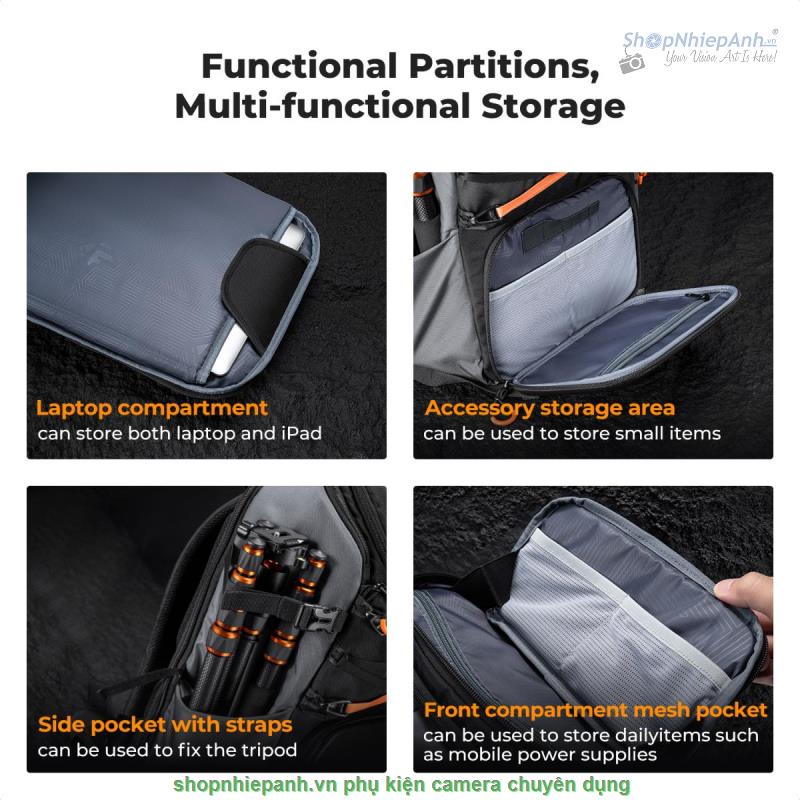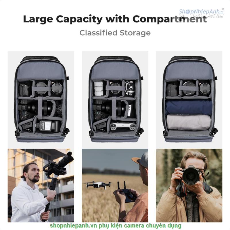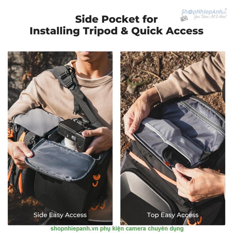 * Khả năng di động và tiện lợi được cải thiện: Dây đai phía trước có thể tháo rời cho phép gắn các phụ kiện ngoài trời như thảm và áo mưa. Truy cập bên hông nhanh chóng đảm bảo lấy thiết bị nhanh chóng, vì vậy bạn luôn sẵn sàng cho bức ảnh hoàn hảo.