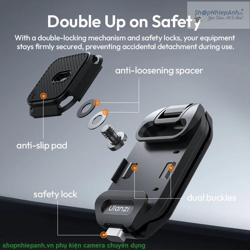 - Thiết kế 2 chốt khóa cùng tấm đệm chống trượt đảm bảo gấp đôi sự chắc chắn và an toàn khi lắp máy ảnh.