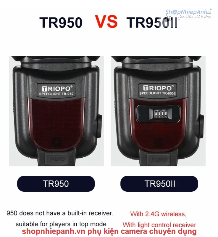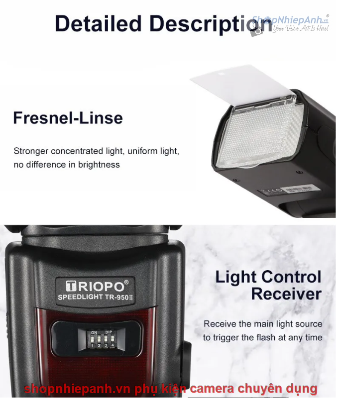 Với tín hiệu không dây tích hợp, Triopo TR-950 II hỗ trợ các chức năng kích hoạt không dây, phù hợp với hầu hết các máy ảnh DSLR có đế gắn đèn flash tiêu chuẩn.