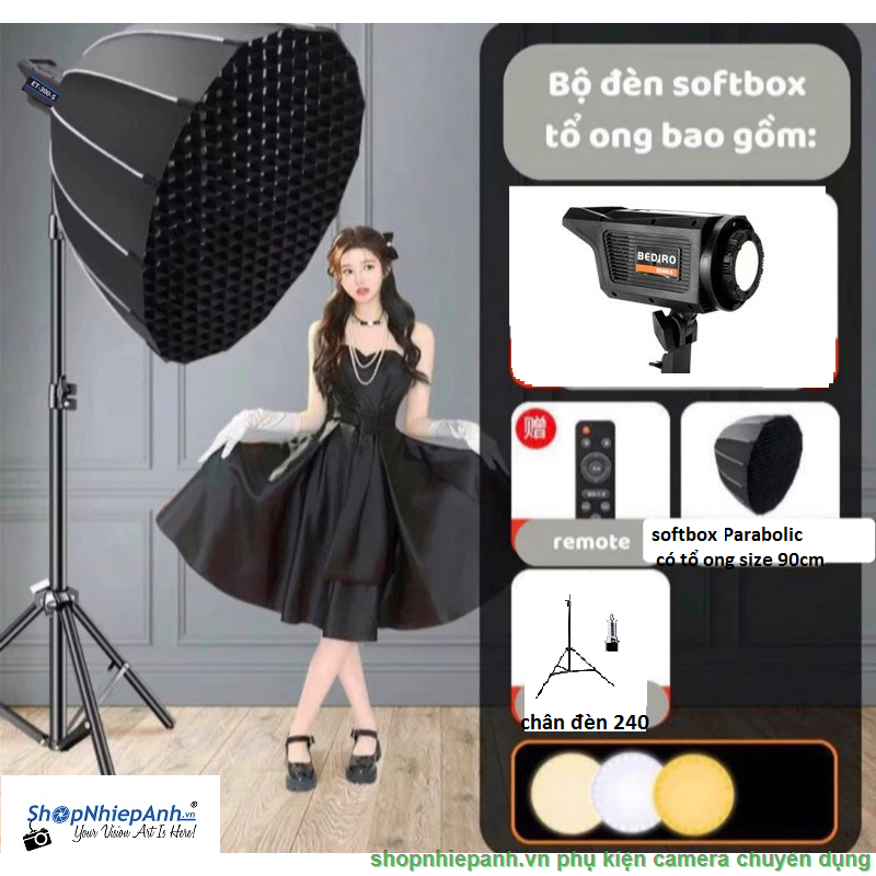 +1 softbox parabolic 90cm kèm tổ ong , phân tán ánh sáng tốt, mịn màng tối ưu hóa cường độ ánh sáng, hạn chế đổ bóng, chuyên dụng chân dung