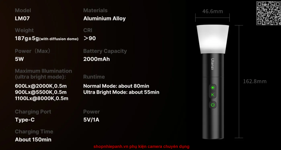Ulanzi LM07, đèn pin LED sạc di động và mạnh mẽ, thích ứng với tầm nhìn sáng tạo của bạn với nhiệt độ màu có thể điều chỉnh (2000K-5500K-8000K) và vòm khuếch tán có thể tháo rời. Kiểm soát bốn mức độ sáng, chế độ đèn flash và tiêu điểm chùm tia có thể thu phóng. Siêu di động (187g) với pin 2000mAh lâu dài và sạc Type-C, LM07 hoàn hảo để chụp ảnh chân dung, quay phim đám cưới, phiêu lưu ngoài trời, v.v.