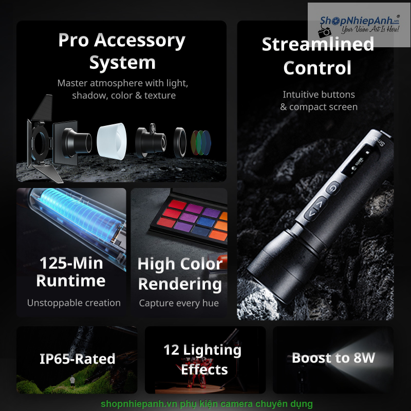 Bộ kit tạo hình ánh sáng đa năng: diffuser, barn door, spotlight, gel RGB