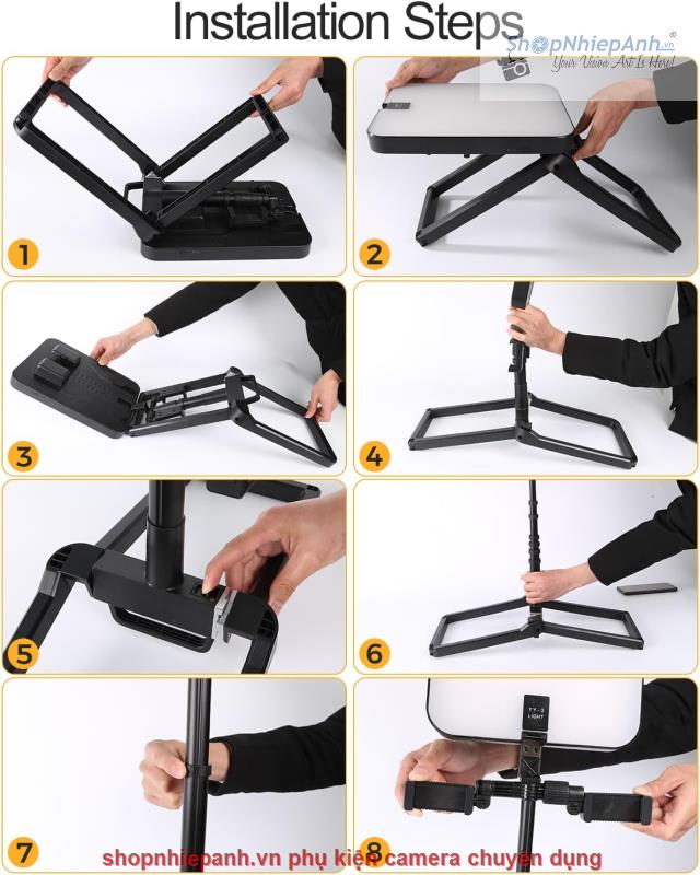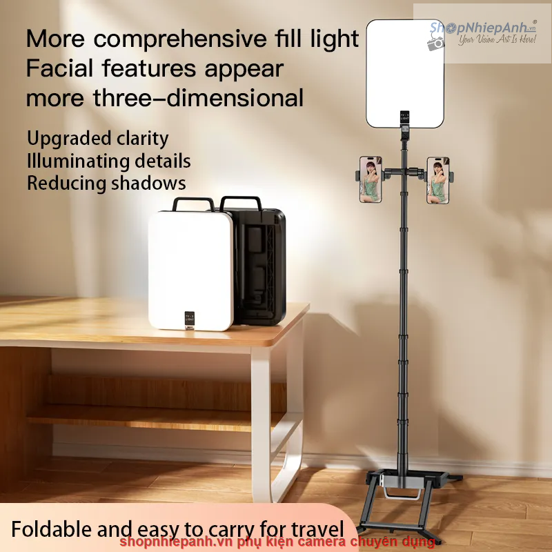 -size đèn khi xếp gọn nguyên khối tổng thể 33x21x6 cm (đã gồm xếp gọn chân đứng và kẹp điện thoại bên trong)