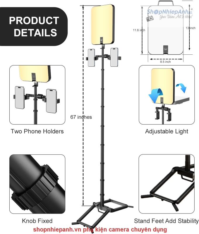 -tích hợp thêm 2 kẹp điện thoại xoay ngang/dọc tiện lợi cho live stream/quay phim