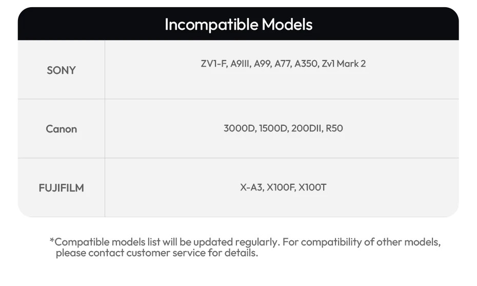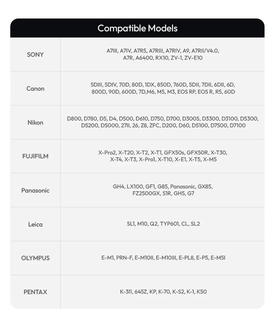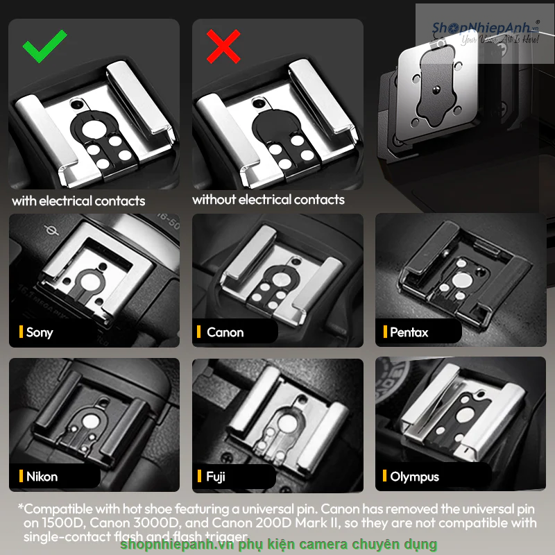 - Ngàm hot shoe phổ thông một tiếp điểm phù hợp với hầu hết các máy ảnh kỹ thuật số trên thị trường