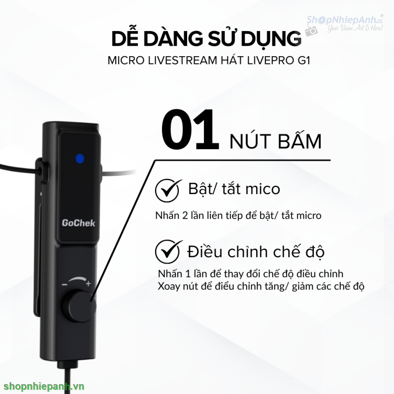 - DỄ SỬ DỤNG: Với thiết kế nhỏ gọn chỉ khoảng 30g, GoChek LivePro G1 tích hợp duy nhất một nút bấm để điều chỉnh toàn bộ chế độ. Người dùng chỉ cần cắm trực tiếp mic vào thiết bị là có thể bắt đầu ngay lập tức, không cần qua bất kỳ bước cài đặt phức tạp nào.