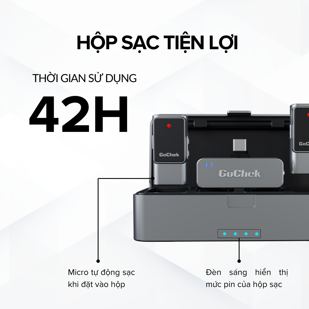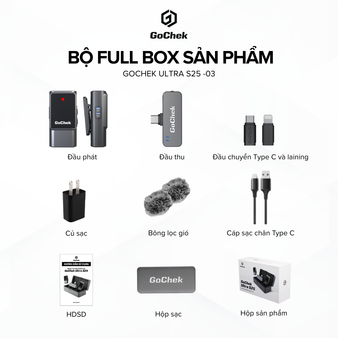 GoChek Ultra S25 là bước đệm nâng hạng cho bất kỳ ai muốn tạo nội dung chuyên nghiệp. Trang bị công nghệ thu âm mới nhất, tự động cân bằng âm lượng, lọc ồn thông minh, tái tạo giọng nói rõ và tự nhiên, GoChek Ultra S25 giúp người dùng tiếp cận chuẩn mực thu âm cao cấp vốn chỉ thấy ở thiết bị đắt tiền. Tất cả được gói gọn trong một giải pháp gọn nhẹ, dễ dùng và giá thành hợp lý, đưa creator, từ người mới đến chuyên nghiệp, lên tầm cao mới trong sáng tạo nội dung.
