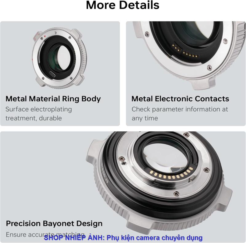 Bộ tăng cường giảm tiêu cự 0,71x: Bộ chuyển đổi ống kính VILTROX EF-M2 Pro có thể tăng một khẩu độ lớn để làm mờ hậu cảnh và làm nổi bật chủ đề tốt hơn. Nhóm hiệu chỉnh quang học tích hợp, khi sử dụng bộ chuyển đổi này, tiêu điểm của ống kính sẽ được rút ngắn X0,71, sau đó nhân dữ liệu này với tỷ lệ chuyển đổi M4/3, đây là tiêu điểm tương đương thực tế của máy ảnh M4/3.