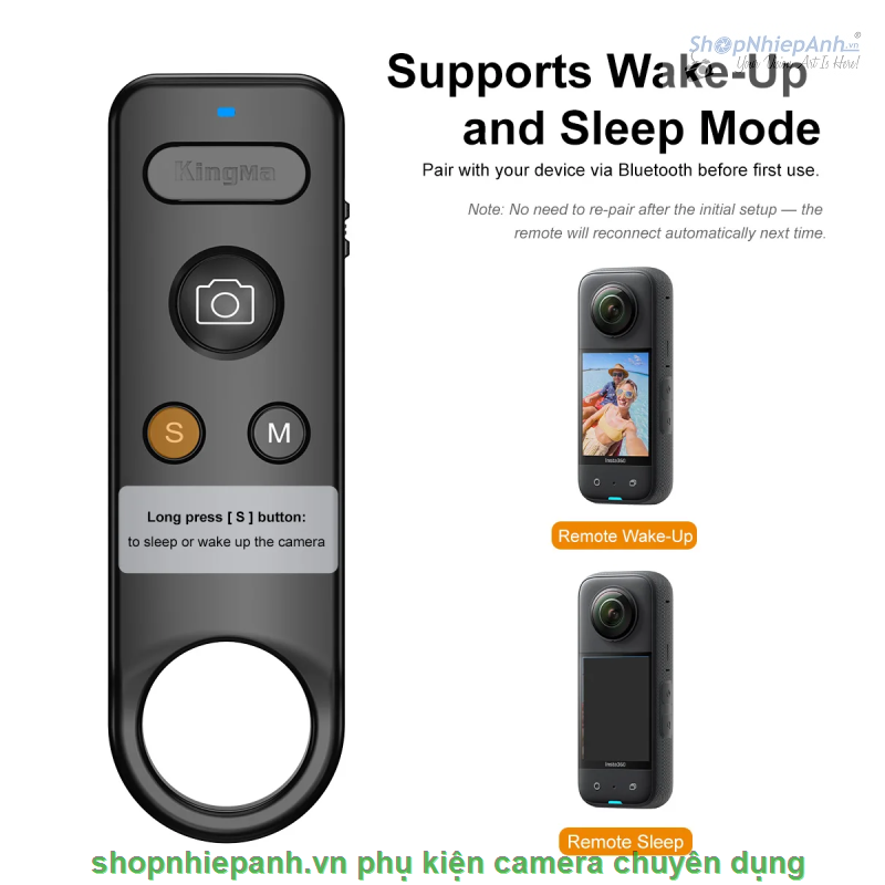 -Đánh thức & Ngủ: Nhấn và giữ nút "S" để đánh thức hoặc ngủ GoPro từ xa—tự động kết nối lại sau lần ghép nối đầu tiên.