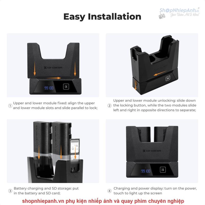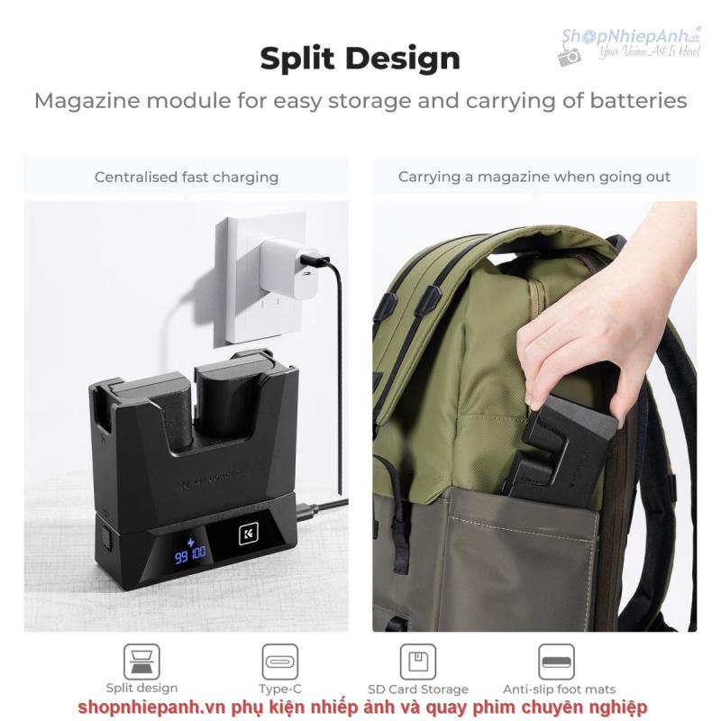 Thiết kế tháo rời có thể thay thế được các dock sạc pin khác nhau, có hộc giữ thẻ nhớ
