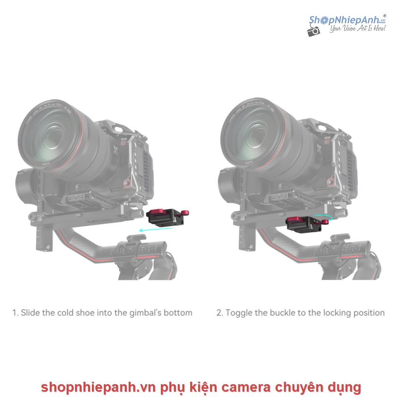 +Thiết kế khóa gạt tháo mở nhanh - đưa ngàm chân cold shoes vào khe cold shoe mặt dưới plate rồi gạt cần khóa lại !