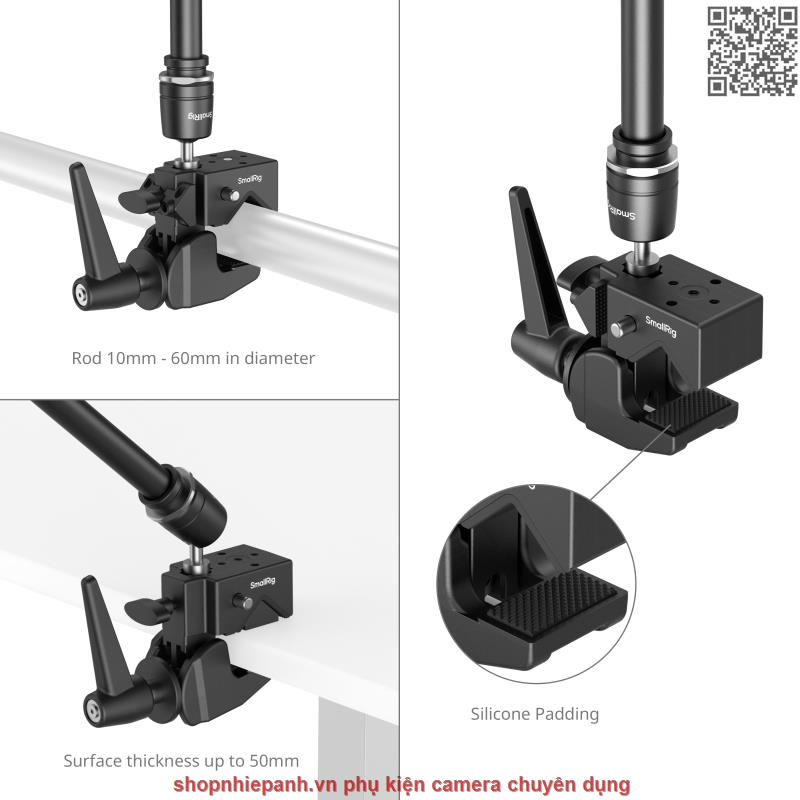 3. Kẹp có miếng đệm chống trượt để tăng cường độ an toàn và ổn định, có thể gắn vào các vật thể hình trụ có đường kính 10 - 60mm / 0,4 - 2,3in và các vật thể phẳng dày tới 50mm / 1,9in.
