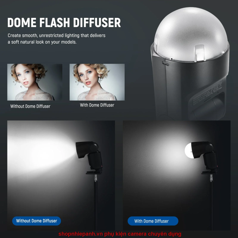 Tản sáng Dome Neewer Z1/Z2/Z2 PRO/Z3/Godox V1/V100 hình vòm độc đáo giúp làm dịu các tia chớp mạnh, gắt và phân tán ánh sáng đều, giảm thiểu bóng đổ. Một phụ kiện tuyệt vời cho đèn flash đầu tròn của bạn để đạt được hiệu ứng ánh sáng dịu và khuếch tán.