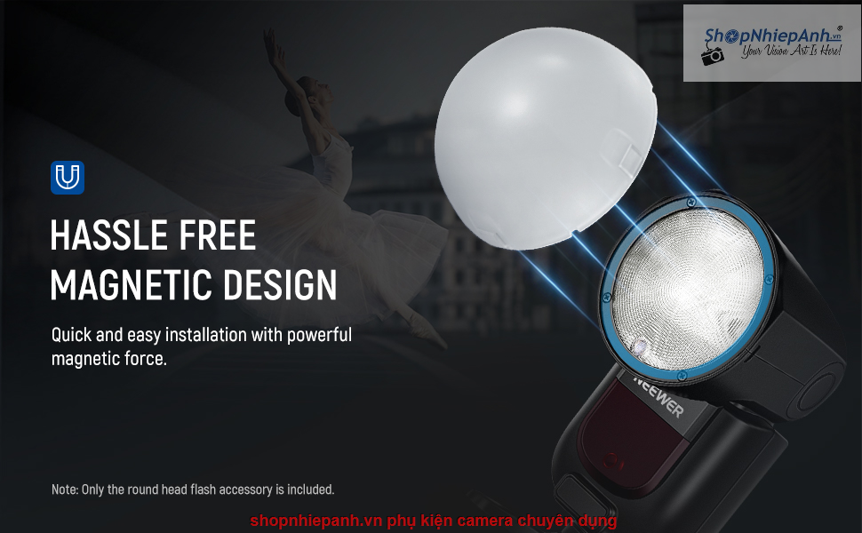 Lắp đặt dễ dàng. Gắn bộ khuếch tán dạng vòm vào đầu đèn flash của bạn chỉ trong vài giây nhờ nam châm tích hợp. Lắp đặt và tháo lắp nhanh chóng. Với lực từ mạnh, bạn không bao giờ phải lo lắng về việc nó bị rơi ra trong khi chụp ảnh.