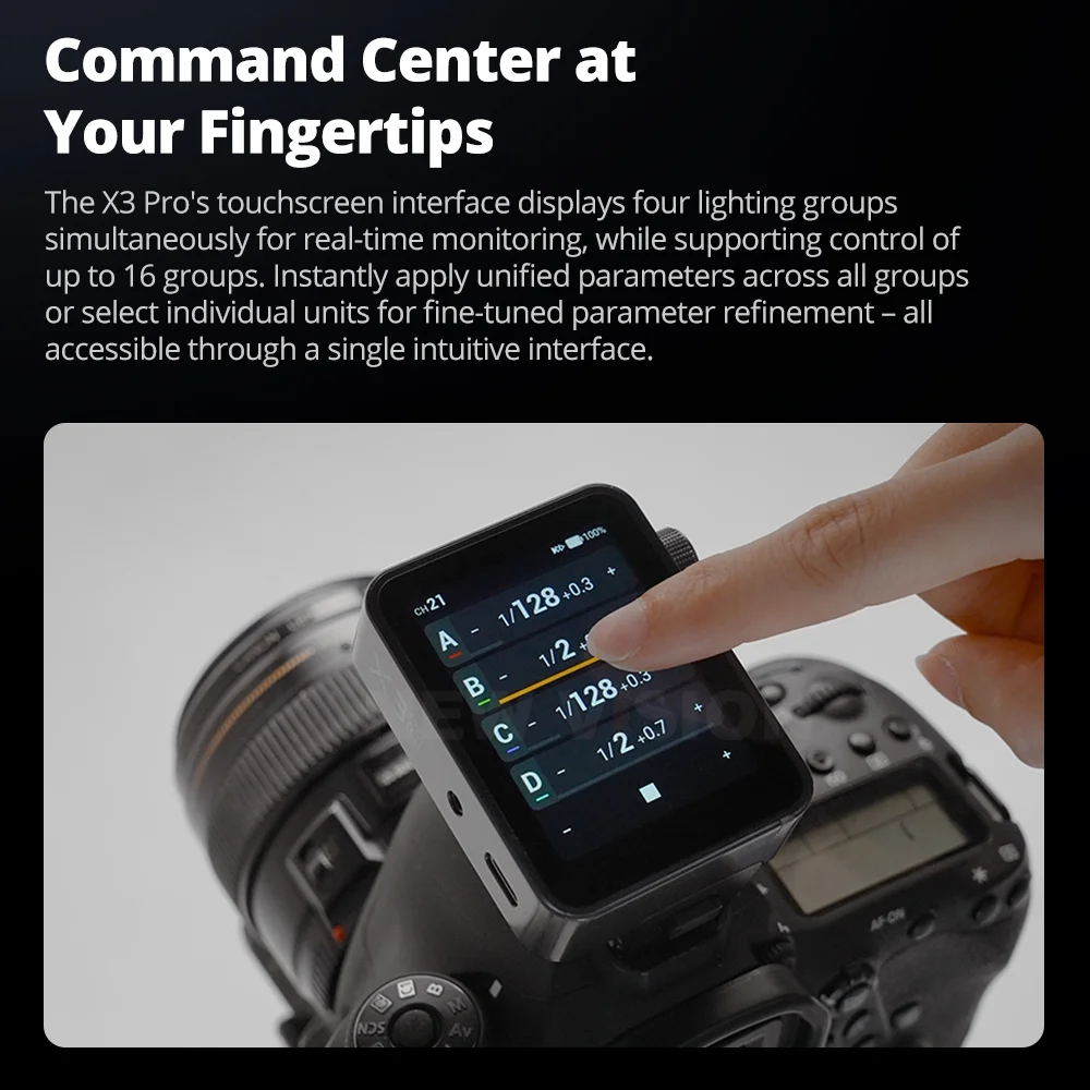Godox X3Pro F là trigger flash không dây TTL, trang bị màn hình cảm ứng màu 2.4″ lớn hơn để điều khiển trực quan, kết nối 2.4 GHz ổn định với hệ thống X của Godox, hỗ trợ TTL, điều khiển nhóm (tới 16 nhóm, 32 kênh, 99 ID) và phạm vi lên tới ~100 m.