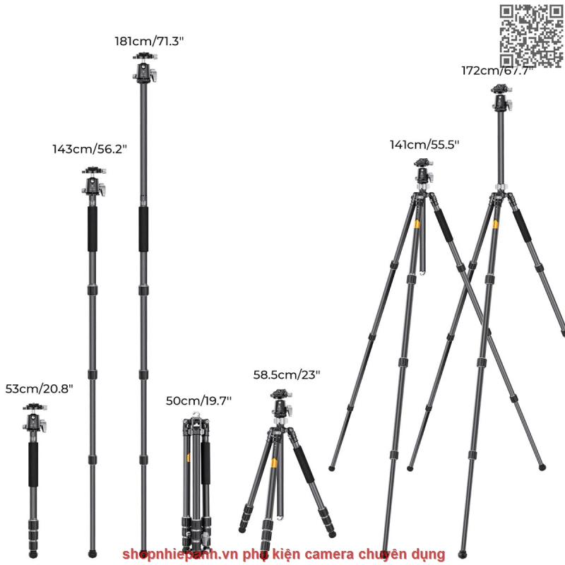 * Kích thước tối đa 172cm, tối thiểu 50cm, chân đơn monopod dài tối đa 181cm